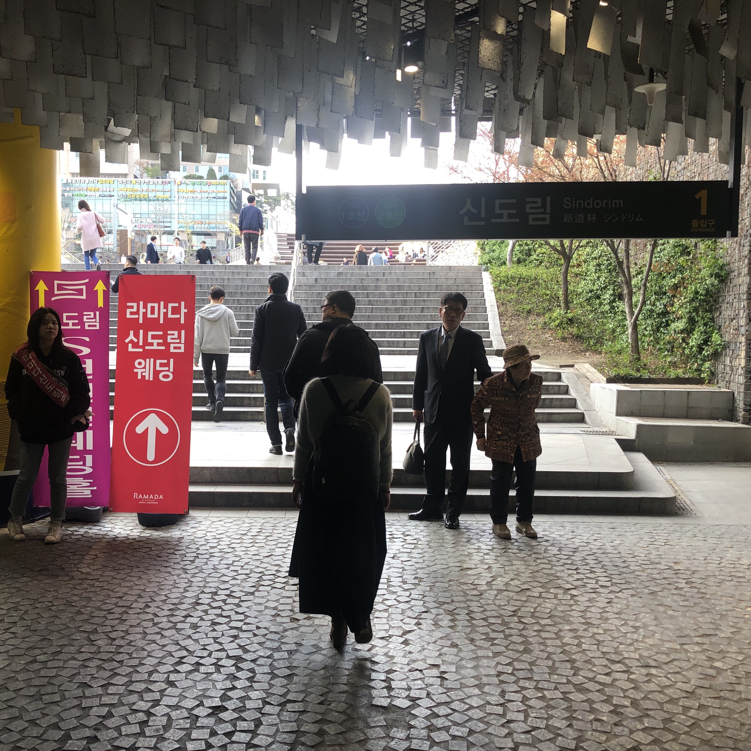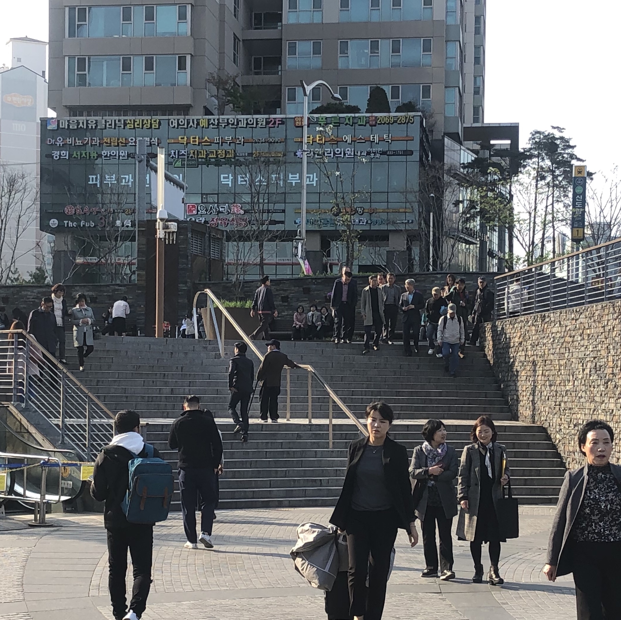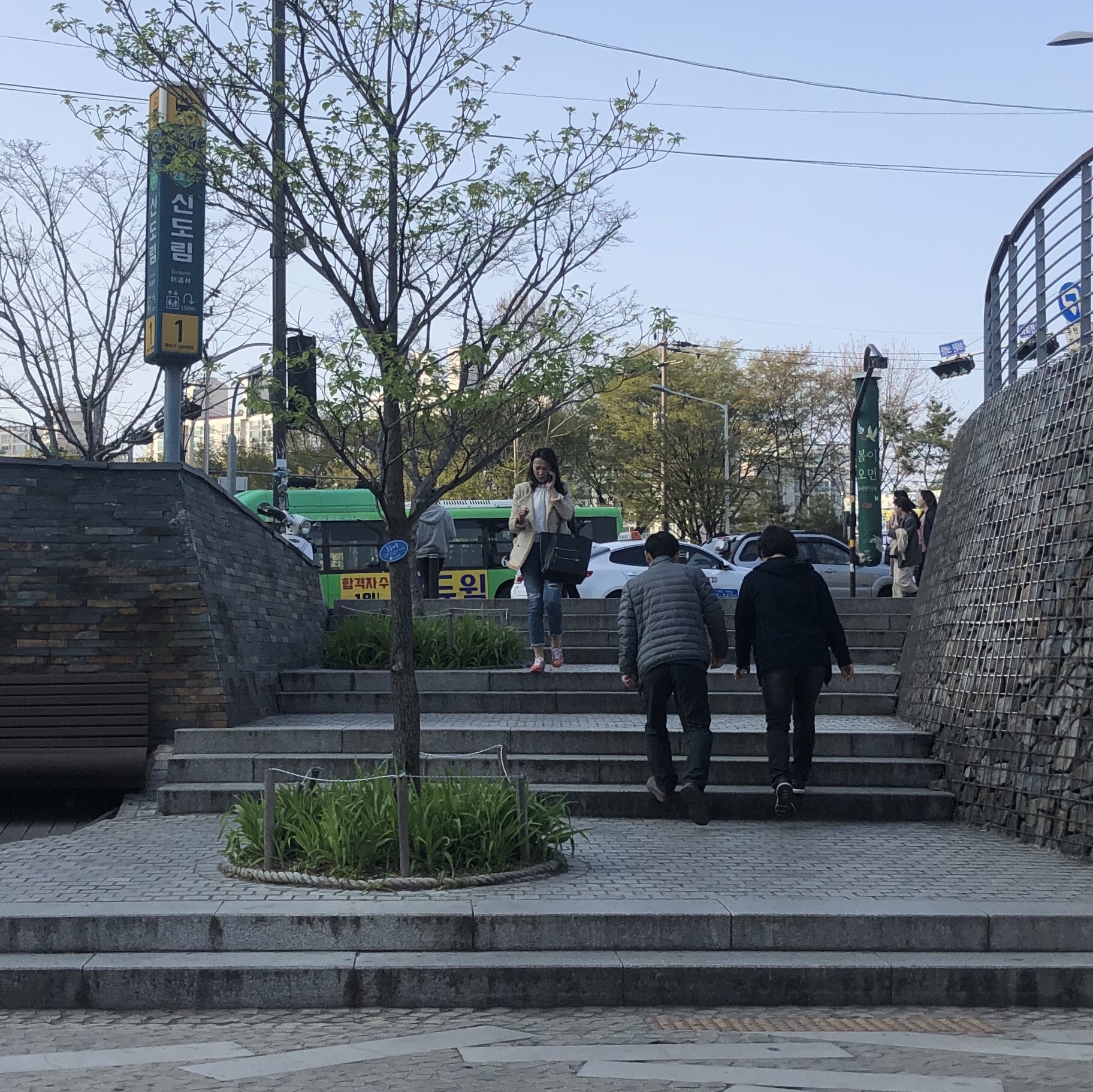 - 계단을 올라와 오른편에 있는 횡단보도 쪽으로 걸어오세요. (만약 걷고 싶은 분, 혹은 휠체어를 타시는 분은 왼편으로 방향을 틀어 현대백화점을 지나 쭉 오시면 됩니다. 횡단보도를 두 번 지나면 라마다호텔이 보입니다. 도보 혹은 휠체어 이동 설명은 여기서 끝.)