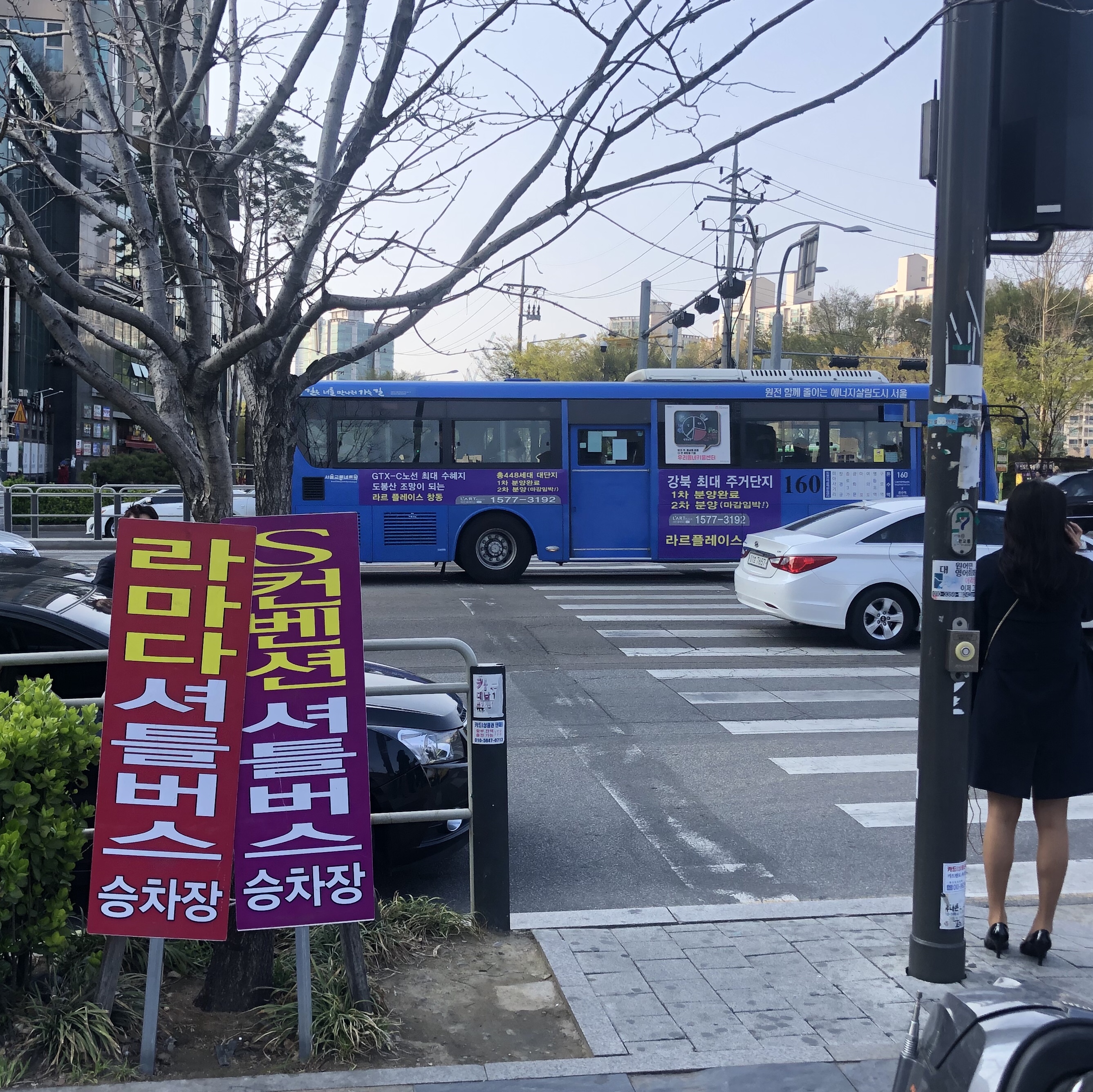 - 횡단보도가 보이시나요? 횡단보도 왼쪽, 배너가 있는 곳에서 차를 타면 됩니다. 다만 교통사정에 따라 횡단보도 오른쪽에 차가 서 있기도 합니다.
