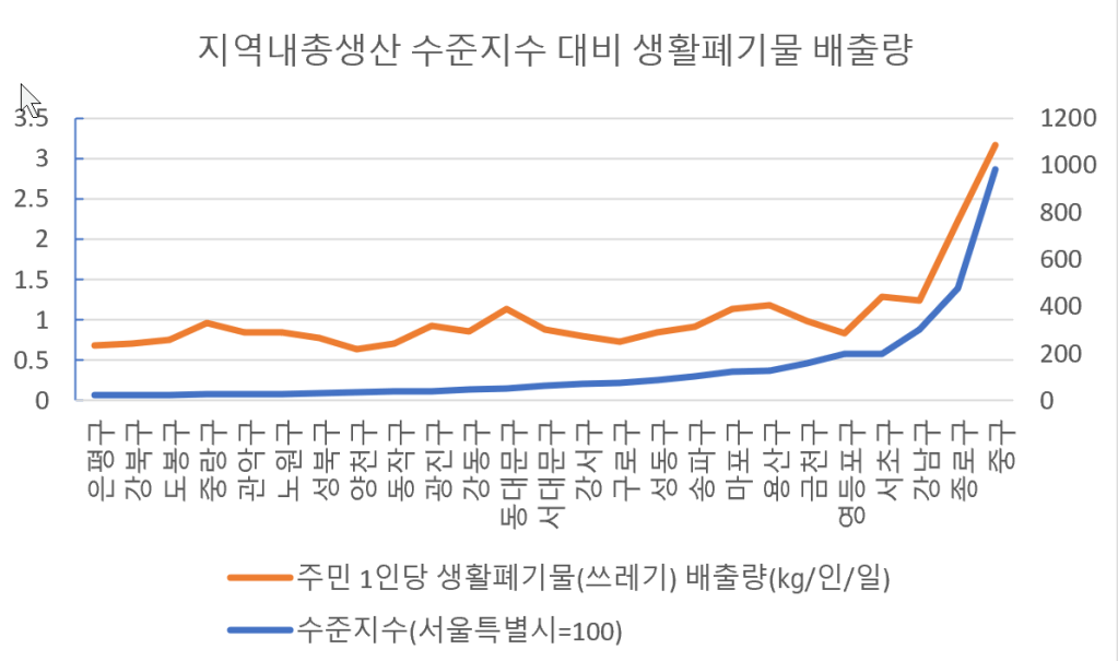 이 자료는 2017년 서울의 지역내총생산 지수에 대비해 각 자치구별로 1인당 지역내총생산의 수준차이에 따라 2018년 1인당 생활폐기물이 어떻게 다르게 배출됐는지를 정리한 그래프입니다. (쉽게 이야기드리면, 생산수준에 따라 생활폐기물 배출량의 차이가 어느만큼인지 보여드리는 겁니다.) 왼쪽에서 오른쪽까지 갈 수록 1인당 지역내총생산 지수가 높은 자치구여요. 이름만 보더라도 흔히 ‘잘 산다’고 하는 곳인건 아시겠지요? (여기서 종로구와 중구는 인구는 적고 기업이 많아서 이처럼 높게 나타납니다, 게다가 상업지구라는 특성도 있구요. 주거지구로 본다면 서초/강남이 높은 수준이에요.) 즉, 총생산 지수가 높을 수록 생활폐기물의 배출량이 많은 걸 확인하실 수 있을 겁니다.