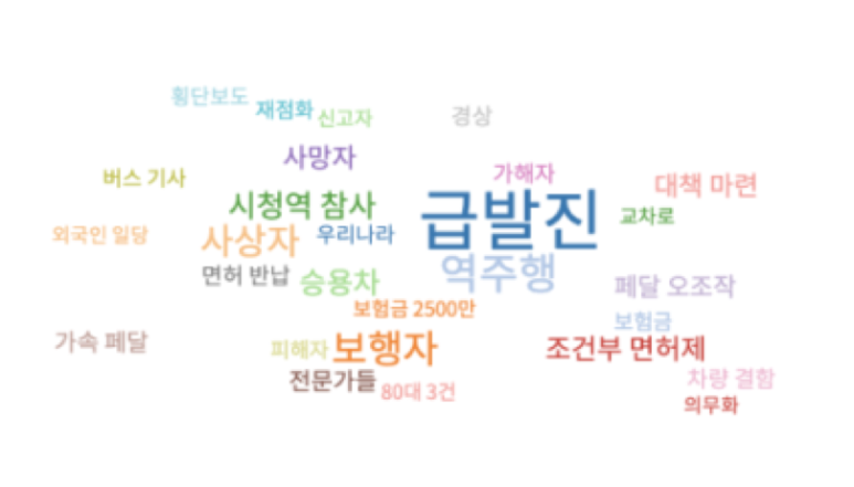 사고 이후 고령 운전자 사고 소식과 대책이 쏟아졌다. 뉴스 분석 사이트인 빅카인즈에서 “고령”, “운전”, “사고”를 검색하면 (2024년 7월 1일부터 8월 29일까지) 총 188건의 기사가 나온다. 보통 동일한 기간 중 10건(2022년), 18건(2023년) 정도의 뉴스가 발견되는 것에 비하면 꽤 많은 수다. 2024년 7월 시청역 사고 이후 발행된 기사에서 추출한 주요 키워드를 놓고 보면 다음 그림과 같다.